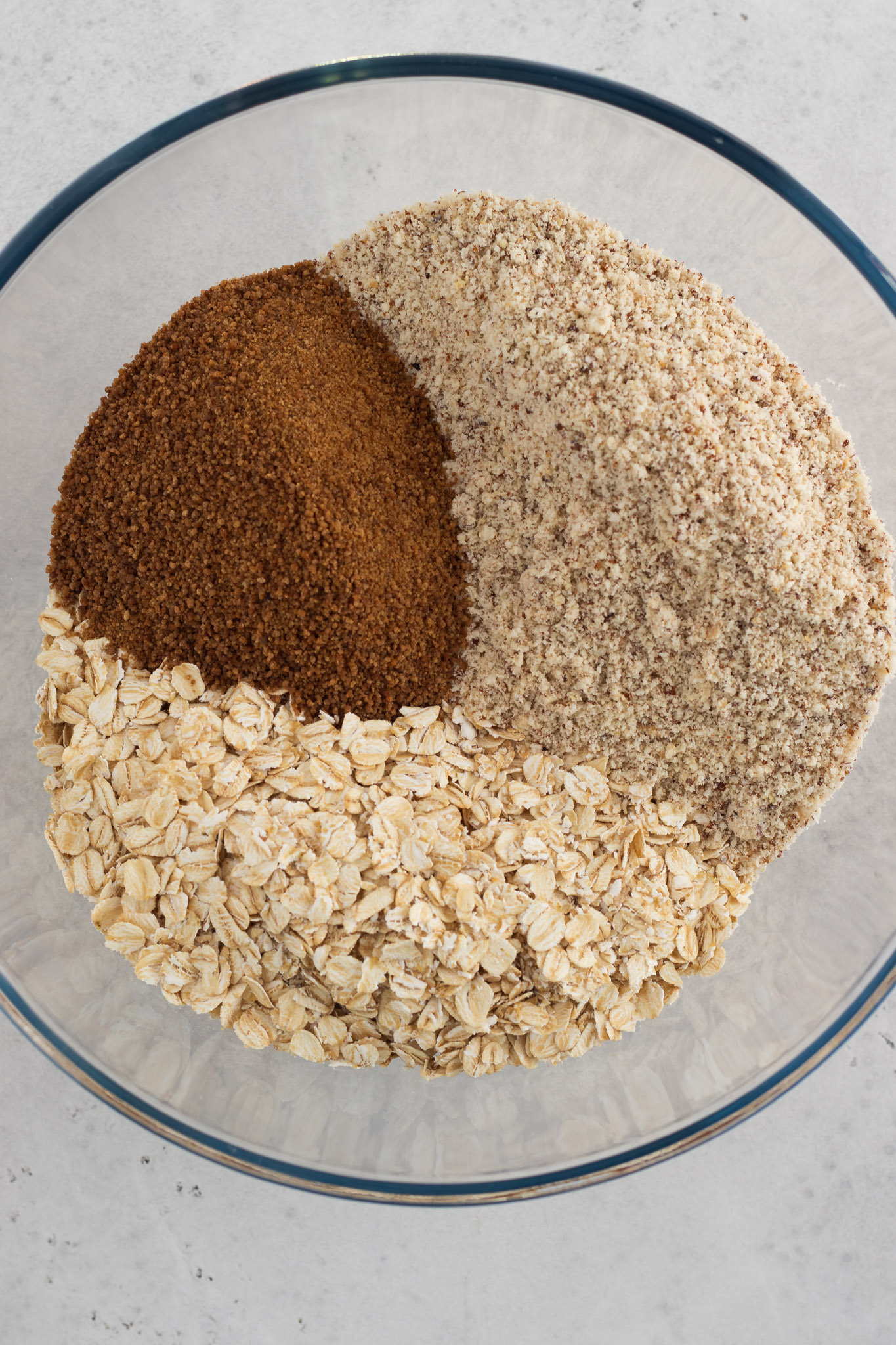 - Into a large mixing bowl at the blended oat, almond meal and coconut sugar. Then add the baking powder, bi-carb soda, ginger, cinnamon, nutmeg, salt and orange zest. Stir to combine.