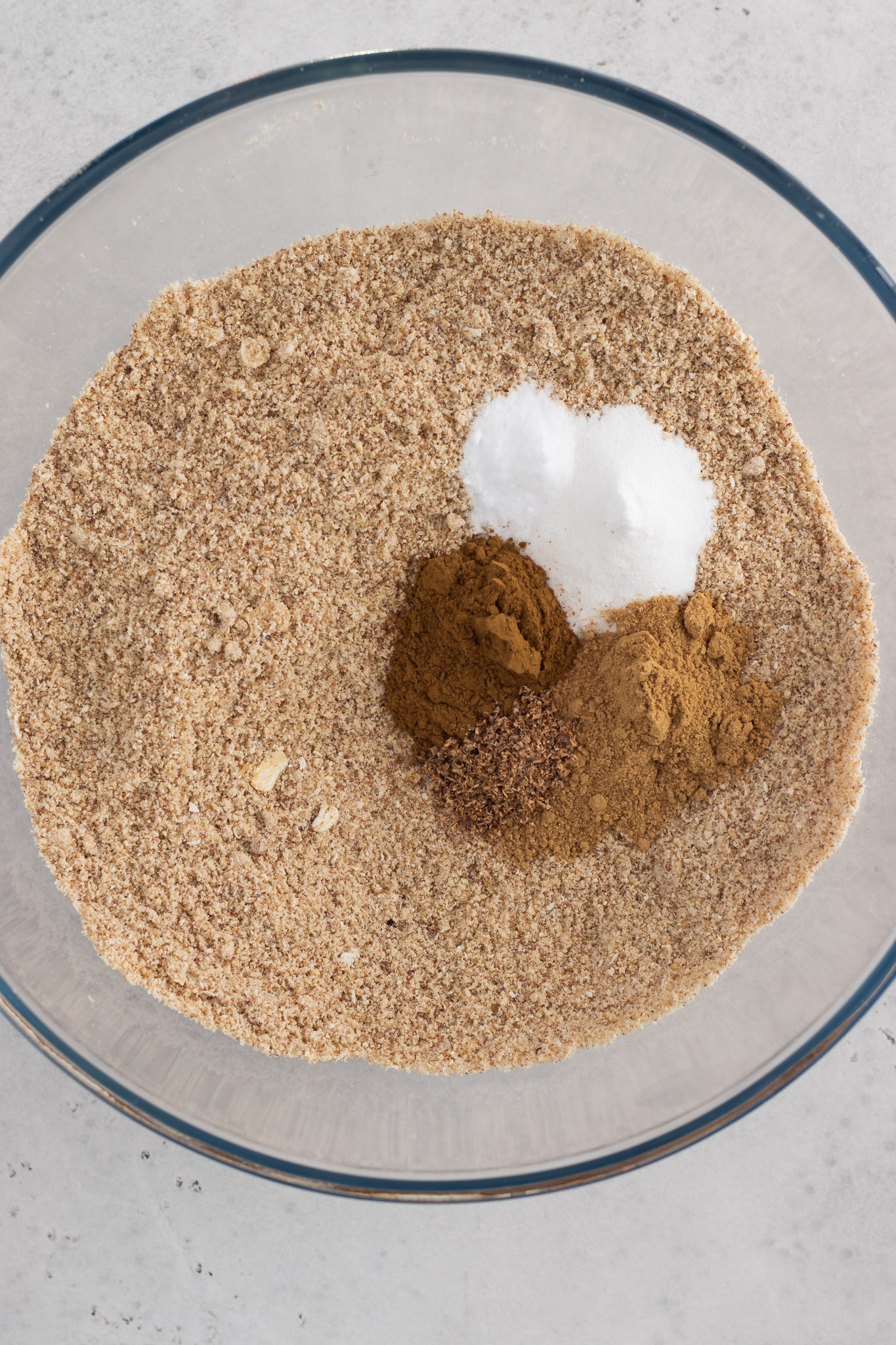 Add the oat flour to a large mixing bowl with the almond meal and coconut sugar. Add in the baking powder, bi-carb soda, ginger powder, cinnamon, nutmeg, salt and orange zest. Mix to combine.