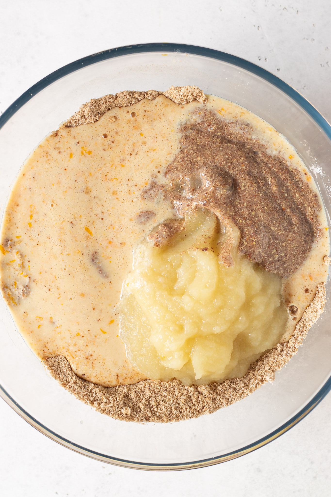 - Mix together the apple sauce, soy milk, maple syrup, orange juice, apple cider vinegar and vanilla essence.