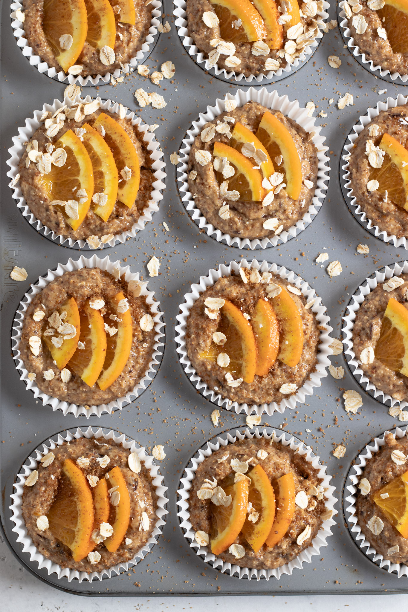 Fill muffin cases evenly with the batter and top with slices of orange and a sprinkle of oats to decorate.